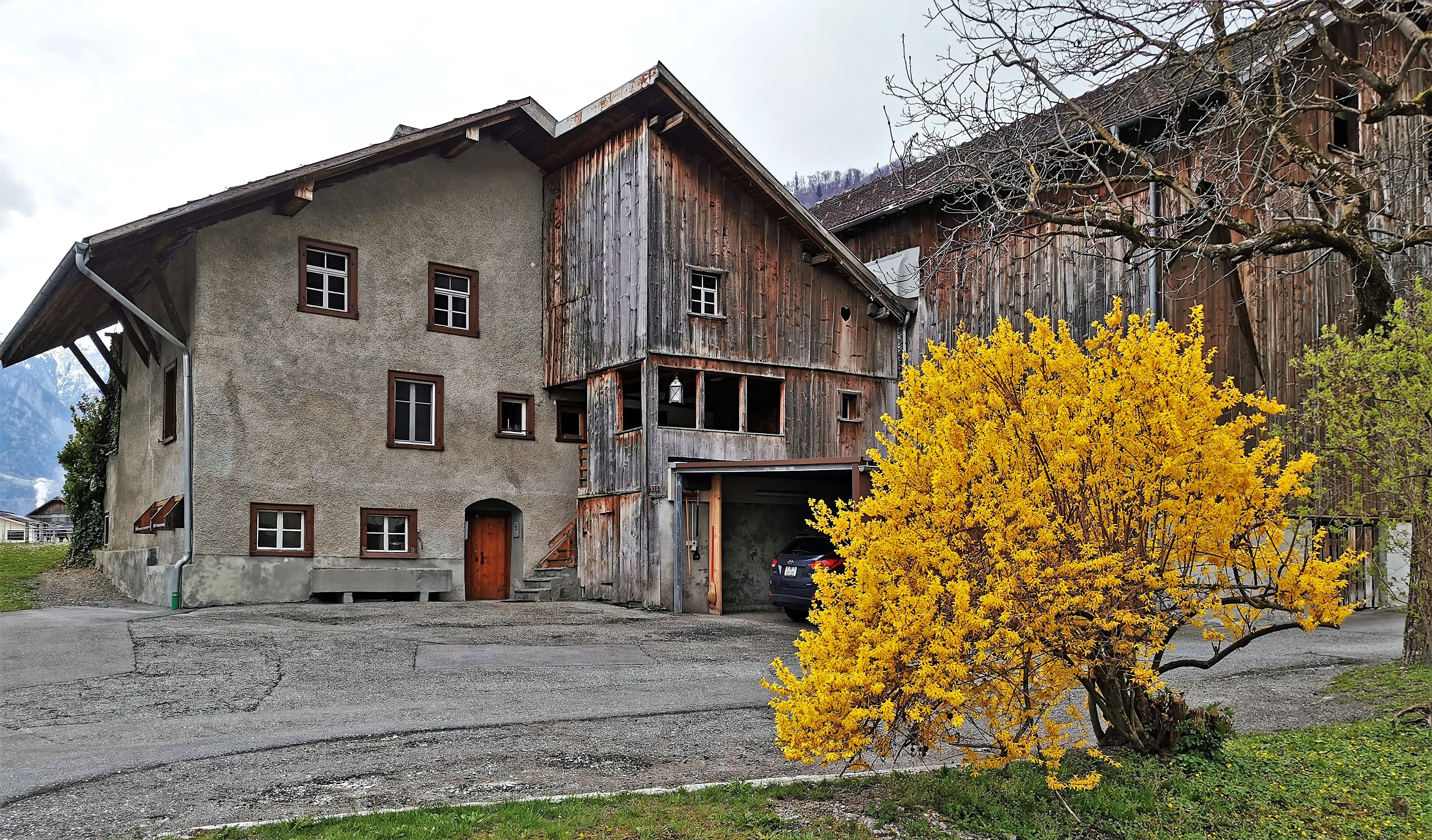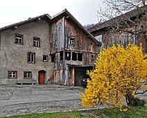 Zu Anf. April schöne blühender Forsythien-Strauch auf dem Stotz-Hof (Haus Nr. 12), Blick aus Nordwesten über den Cosenzbach hinweg.