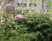 Pfingstrose (Paeonia) zu Anf. April in einem Vorgarten an der Hintergasse nahe dem Platz