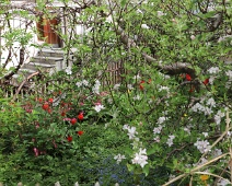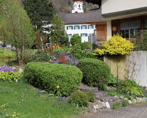 Vorgarten mit zahlreichen Frühlings-Blühern am Bawangs (Haus Nr. 16) zu Anf. April. Im Hintergrund Pfarrhaus und ein Teil vom Kirchturm der kath. Kirche.