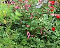 Tränendes Herz (Lamprocapnos spectabilis), umrahmt von Tulpen in einem Garten am Bsetzi zu Anf. April