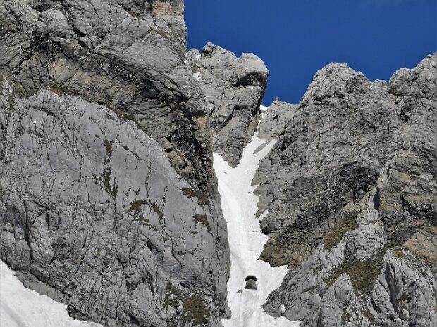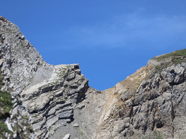 Schluchtartige Scharte (2.543 m) am Mättnergrat welche vom oberen Hinder Tal in nördliche Richtung aufwärts zieht. Steinböcke und Gemsen nutzen den Aufstieg zum…