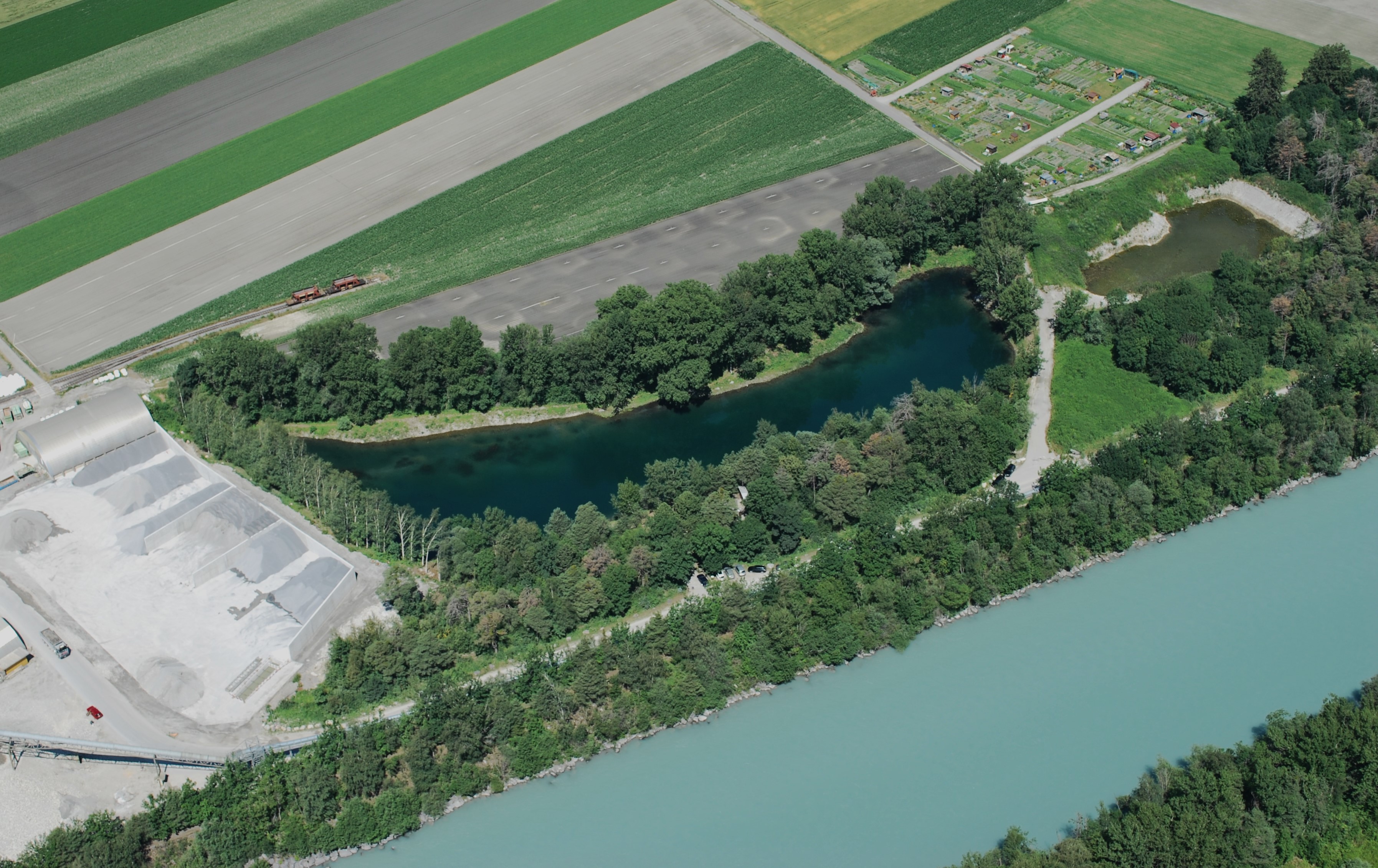 Blick von Nordosten über den kleinen Weiher hinweg, direkt dahinter das Kieswerk Untervaz. Oben rechts im Bild der Fenza-Steinbruch, Aufnahme von 2018.