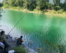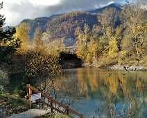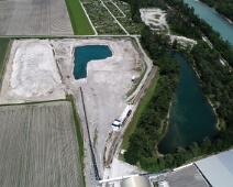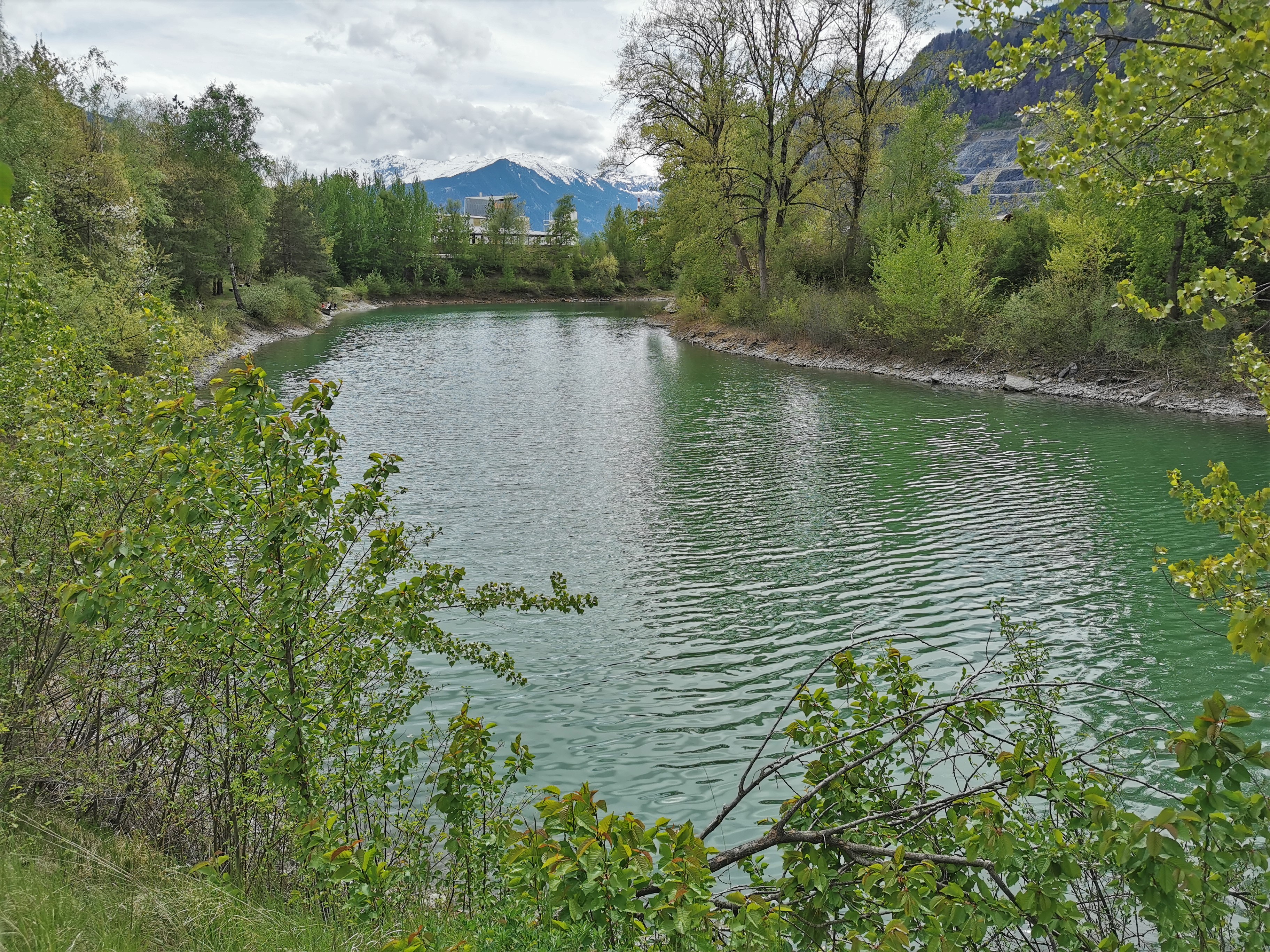 Blick nach Süden über den südl. Abschnitt des Gewässers. Direkt dahinter das Kieswerk Untervaz, etwas weiter entfernt, rechts dahinter das Zementwerk. In der…