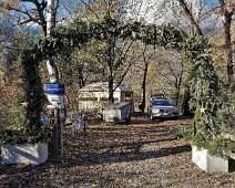 Eingangstor zur kleinen Waldhütte am Renggli-Weiher, in diesem Fall geschmückt für das bevorstehende Adventsfest bei der Hütte. Blick von Osten von der der…
