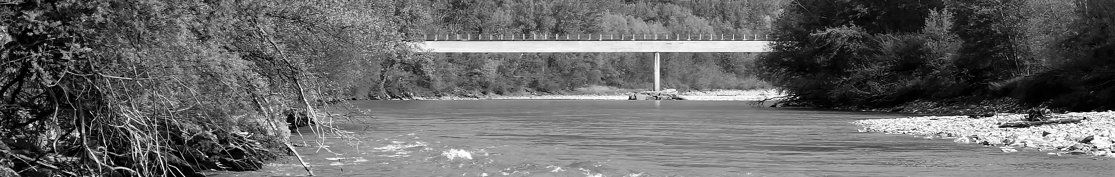 Blick vom Rheinufer an der Isla den Fluss stromab bis zur Brücke. In diesem Bereich fliesst der Rhein vorrangig am linken (Vazer) Ufer entlang.