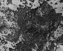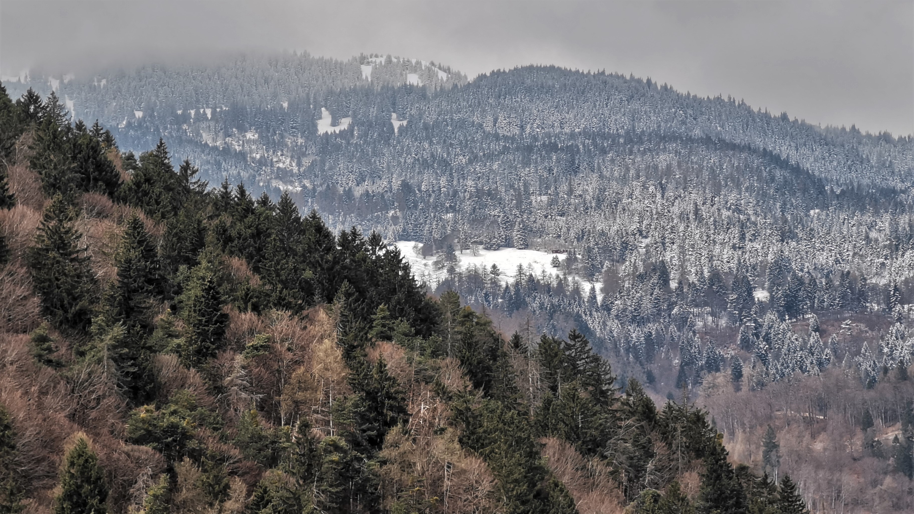 Blick vom Nordrand der Abraumhalde an der Fenza (auf ca. 593 m Höhe) über das Valcosenz hinüber zum verschneiten Waldgebiet am Bärengüllenwald (links oben) mit…