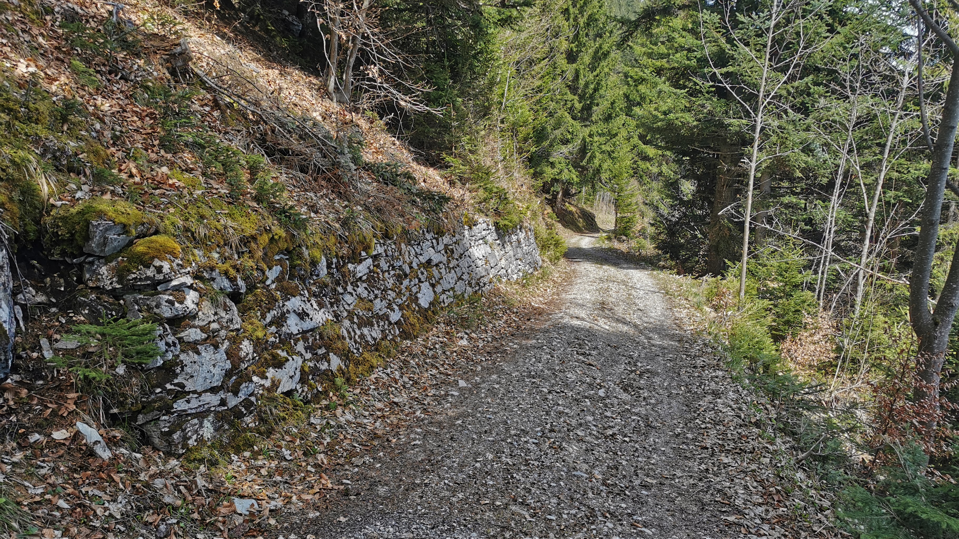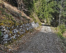 Gut erhaltene Natursteinmauer am alten Alpweg (auf ca. 1.420 m Höhe) durch den Bäragüllawald in Richtung Beeritumpf.