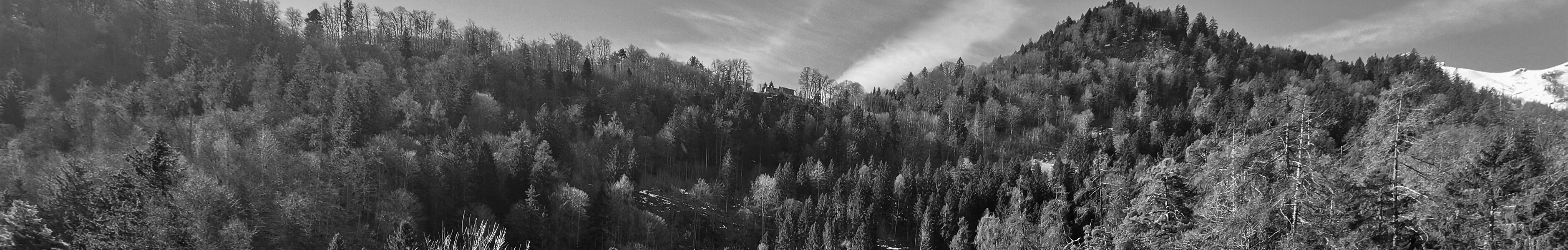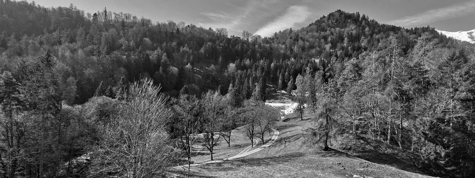 Ausschnitt aus einer Aufnahme von Sept. 1997 aus ca. 3'200 m Höhe (Infrarot, nach schwarz-weiss konvertiert). Der Färawald erstreckt sich im Bild von links…