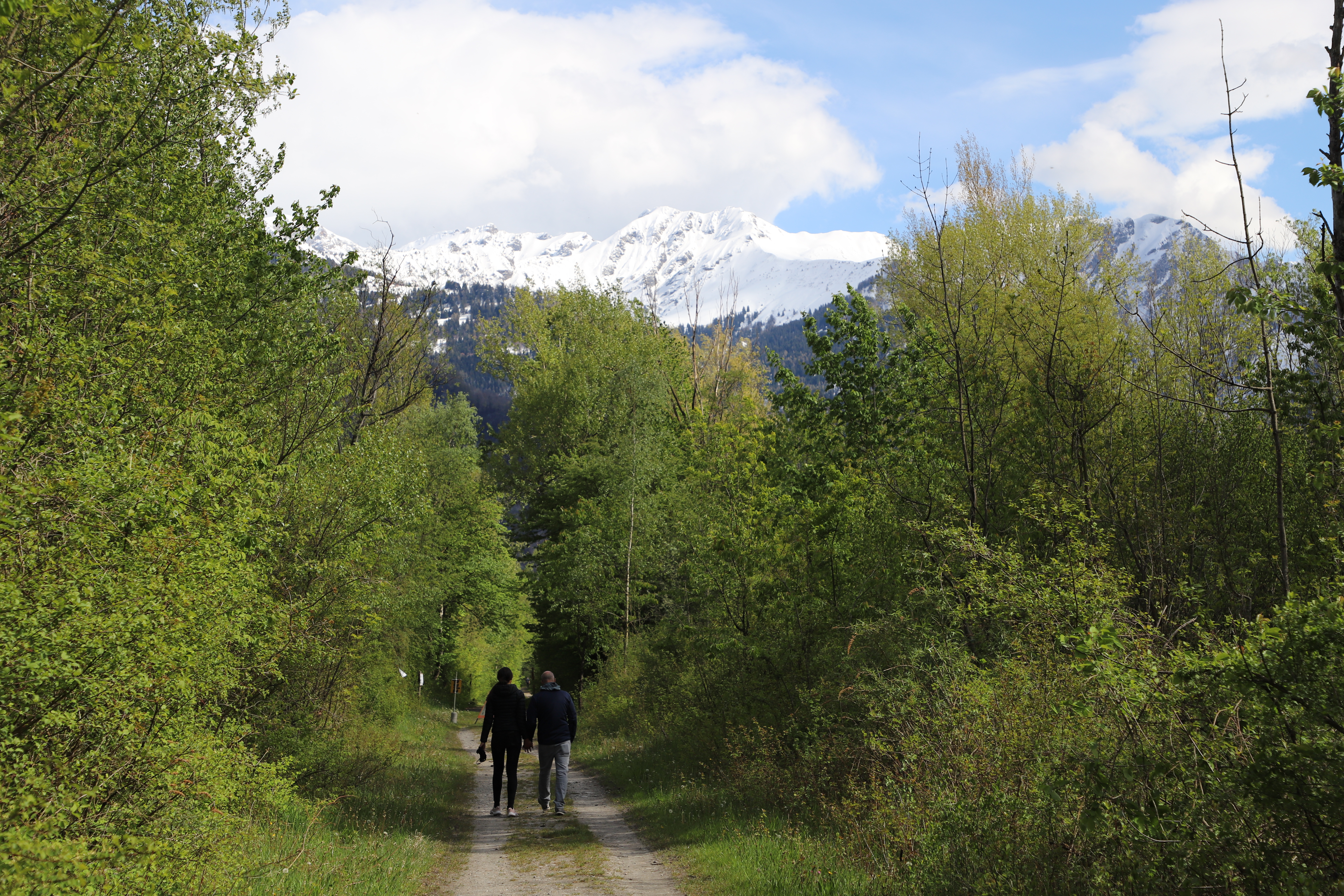 Blick entlang des Auweges nach Südosten bis zu den tief verschneiten Hochwang-Bergen, Aufnahme von April 2024.