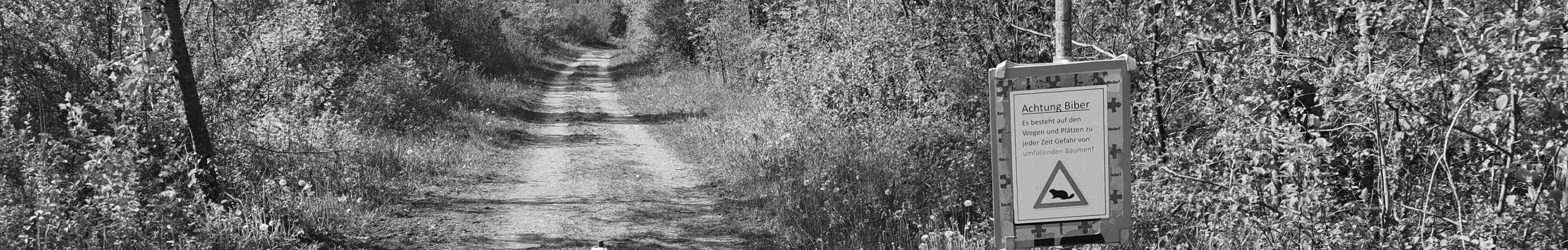 Warnhinweis bezügl. der Biber im Auwald nahe der Einmündung des Deponieweges in den Auweg (im Bild). Blick nach Nordwesten.