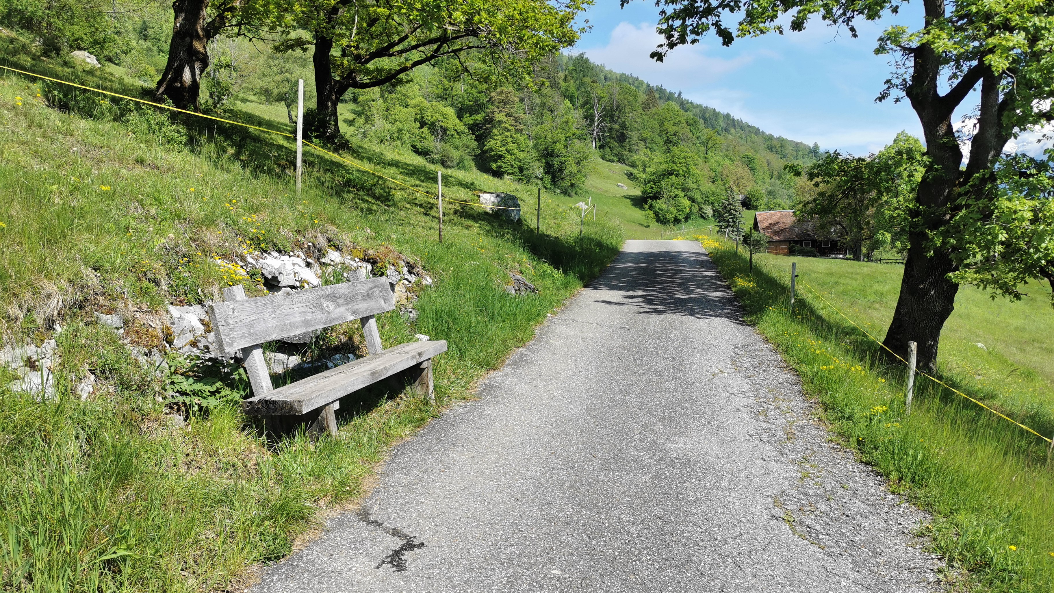 Blick vom Südrand der Frättiser Flur nach Norden entlang des Weges. Links eine Sitzbank der Burgenvereins Untervaz. Aufnahme von Mai 2023.