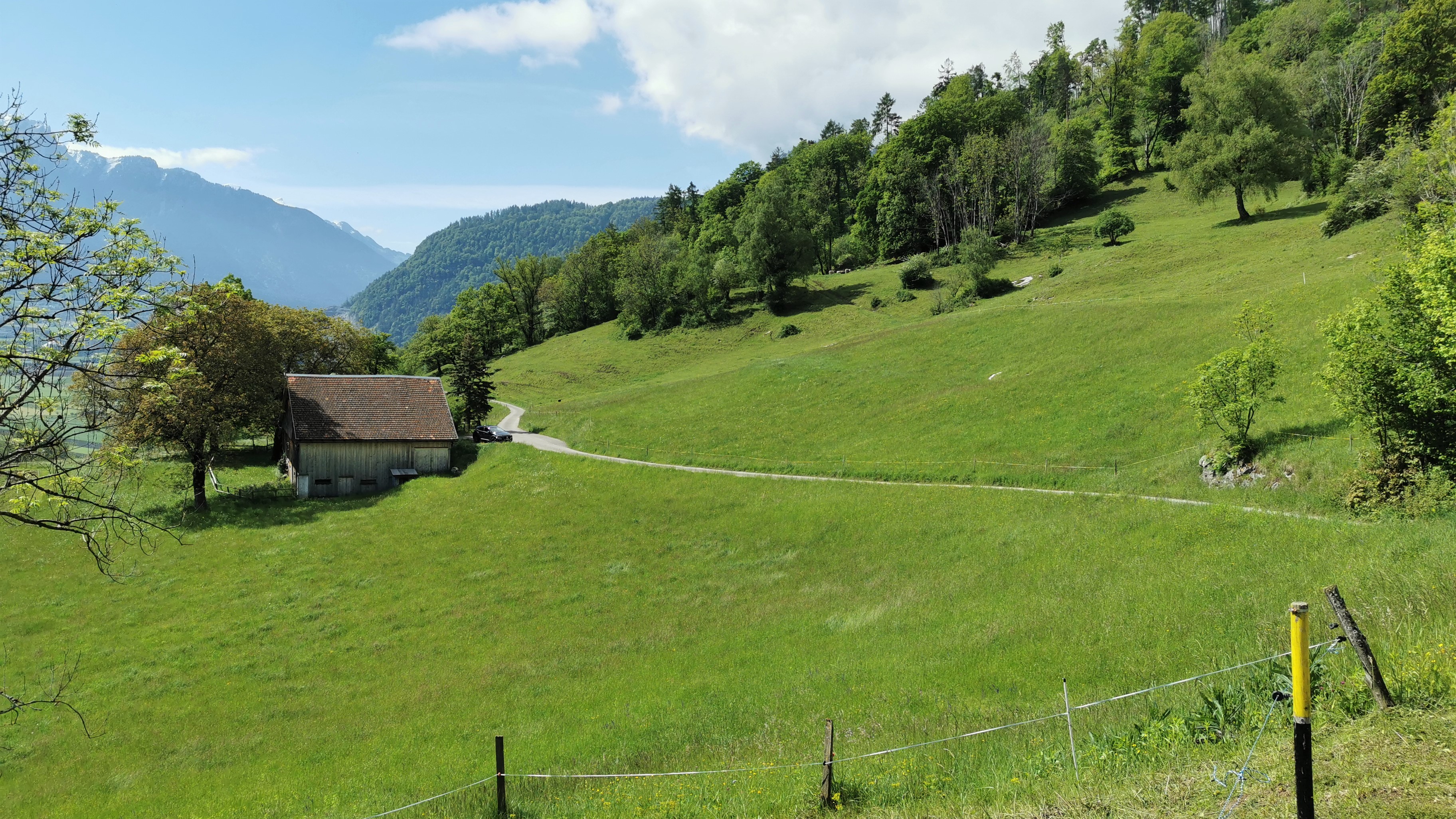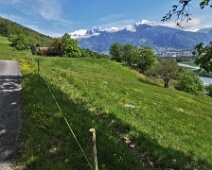 Blick nach Südwesten direkt von der Gemeindegrenze zu Mastrils zur Frättiser Flur, über die der Oberer Löserweg hinweg führt. Links das Stadel vom Berggut…