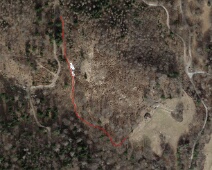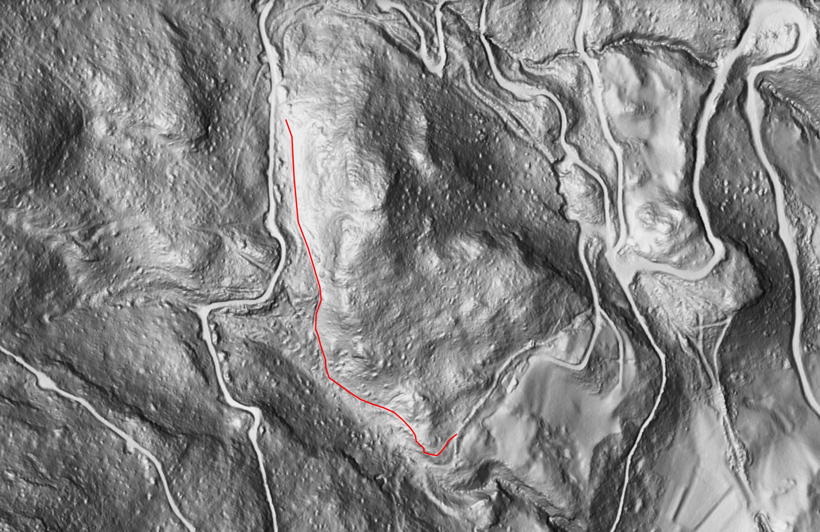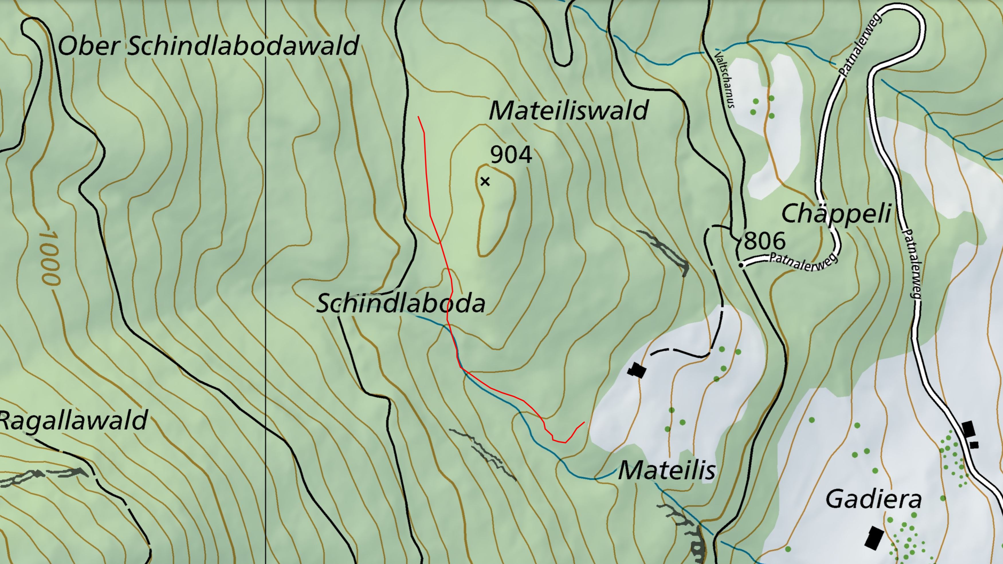 Radarbild mit nachträglich eingezeichneten Verlauf des Weges, der Schindlaboda befindet sich leicht links der Bildmitte, in der Bildmitte das Mateilisbüheli…