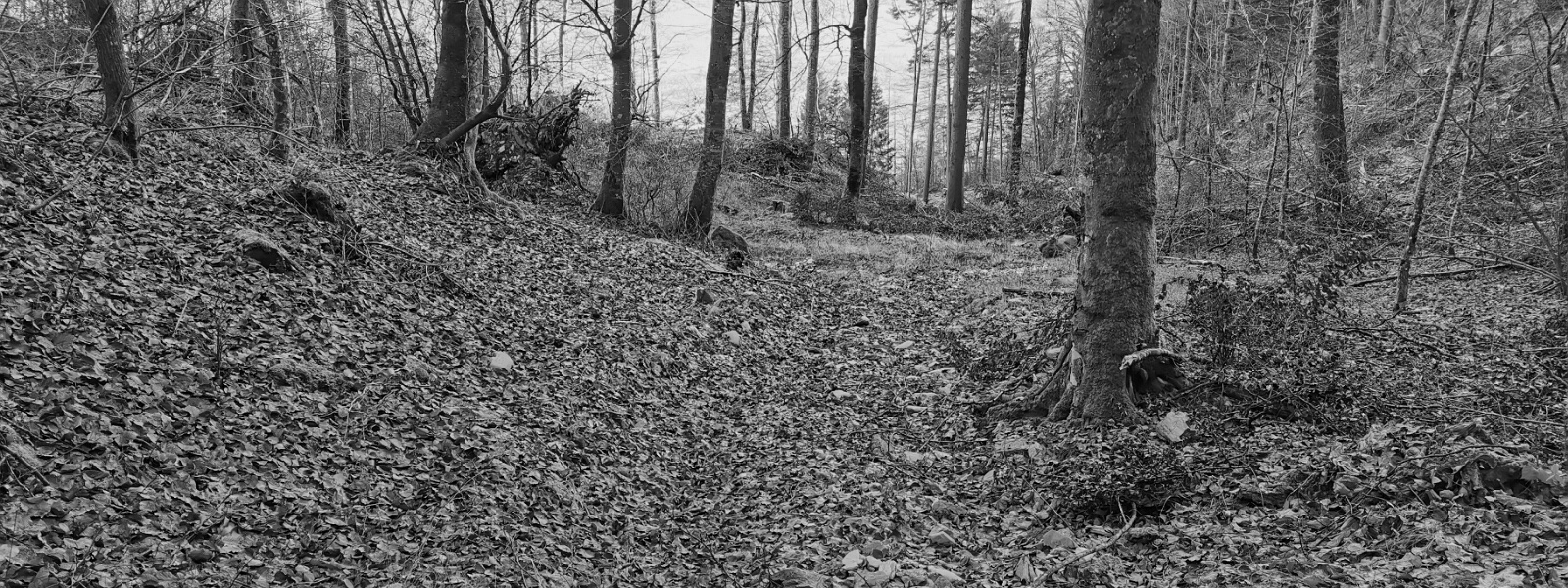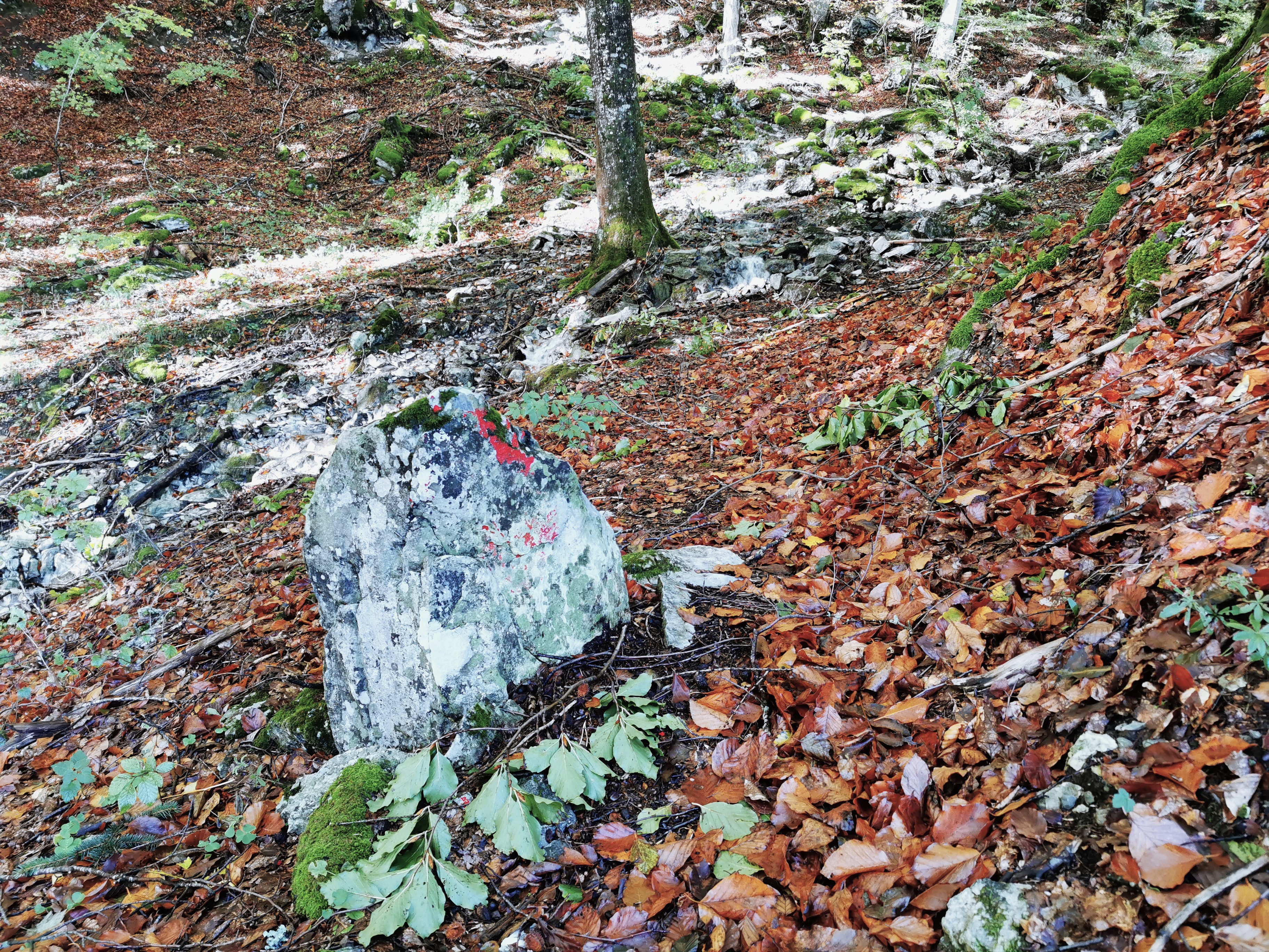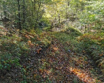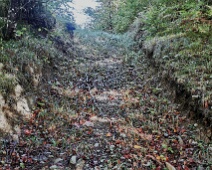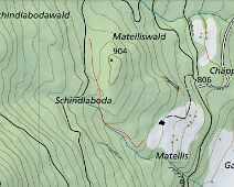 Blick in Richtung Südosten den Weg abwärts im unteren Bereich des Schindellochs, unweit der Mateilisquelle. Auch hier geben zahlreiche Steine auf dem Weg einen…