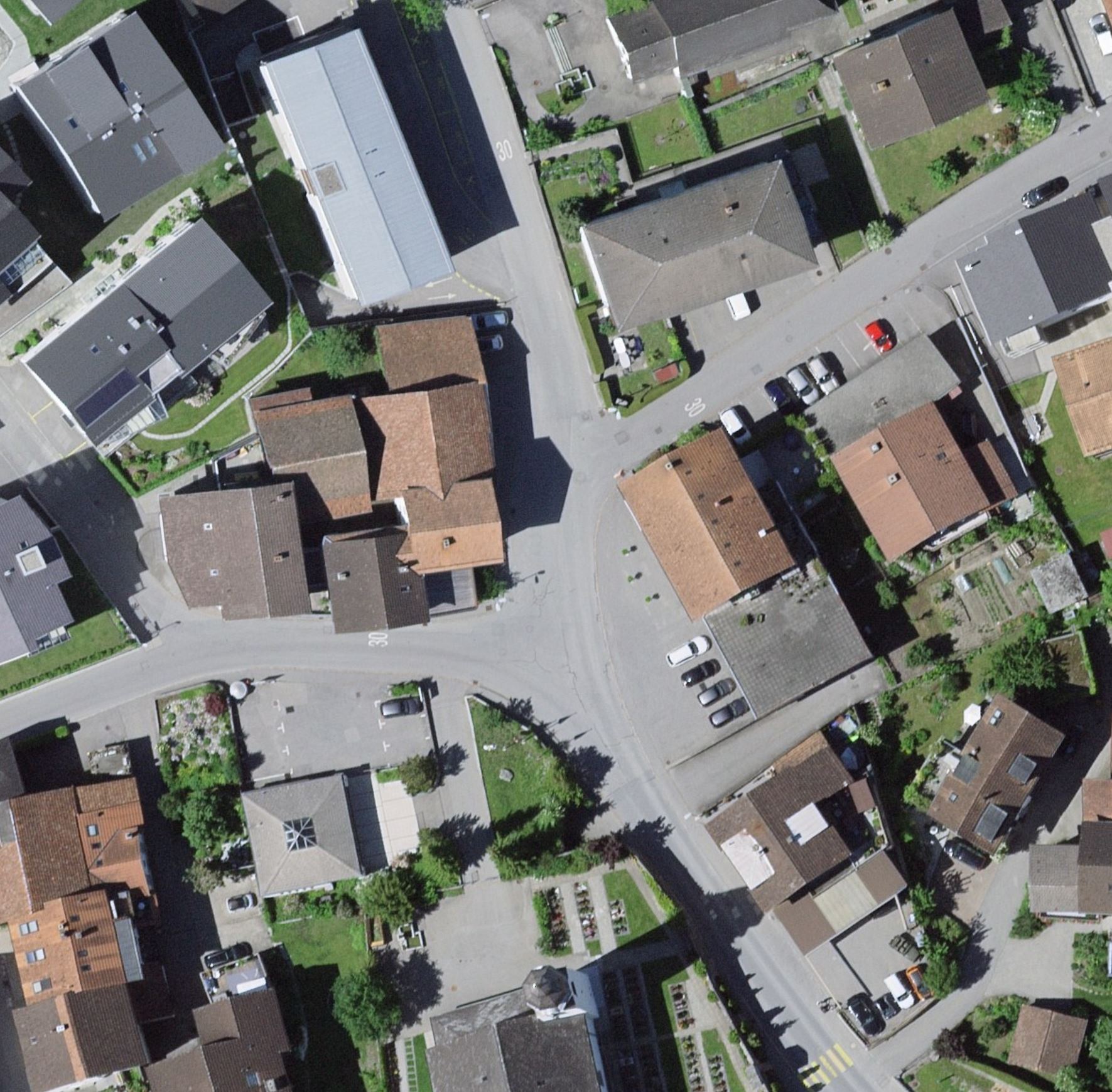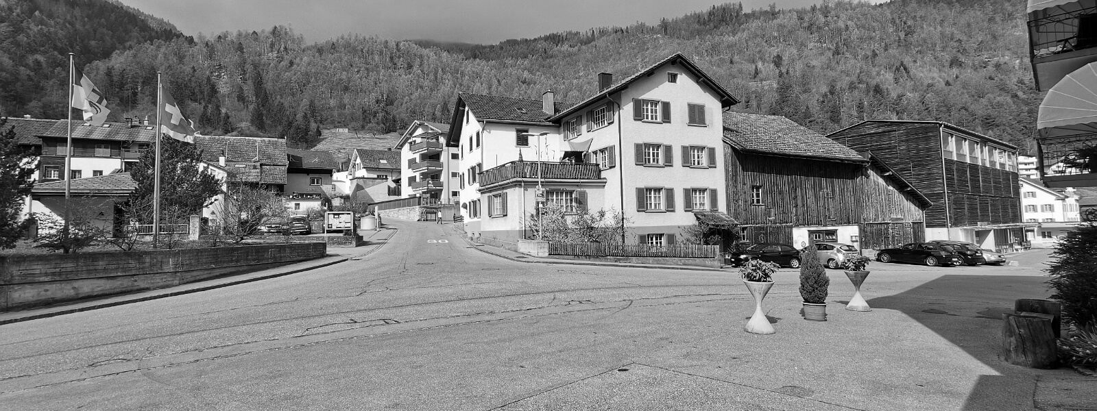 Blick vom Vorplatz des ehem. Restaurants 'Linde' nach Westen auf den Platz mit der gegenüber liegenden Einmündung der Vordergasse. Rechts die Ableitung zur…