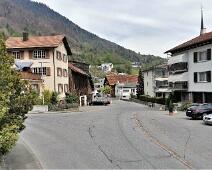 Blick vom Vorplatz der kath. Kirche nach Nordosten auf das Wohnhaus Platz Nr. 2 mit seinen eigenwilligen, auf einer Seite überkragenden Torbogen um den Verlauf…