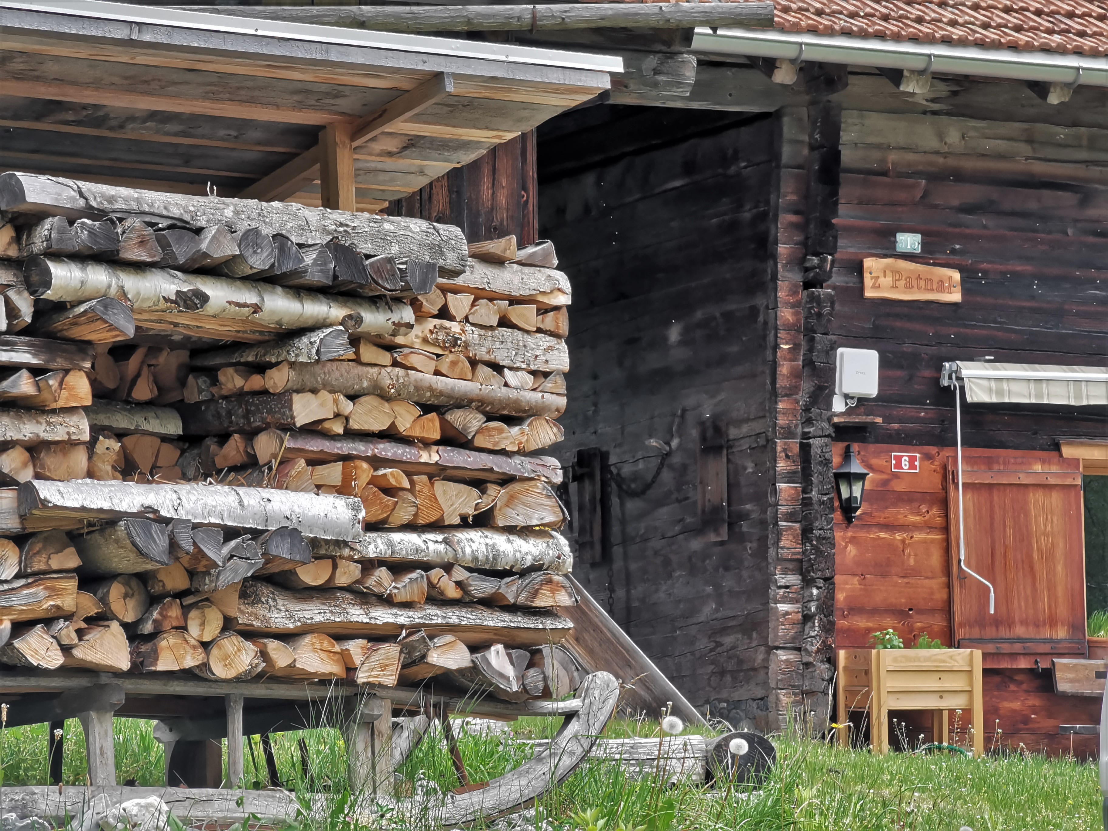 Details vom Wohnhaus Patnal Nr. 6 'z'Patnal' (auf ca. 758 m Höhe, Haus Nr. 315), etwas nördlich des Patnaler Büheli. Links 'vorbildlich' geschichtetes Brennholz…