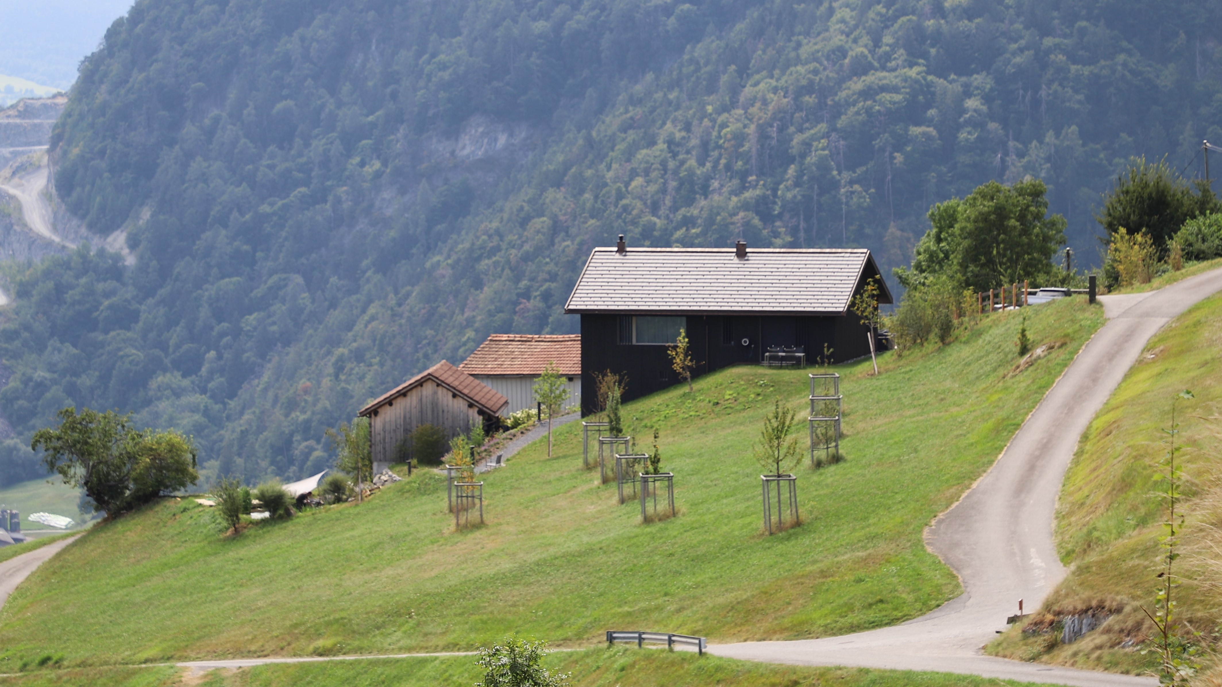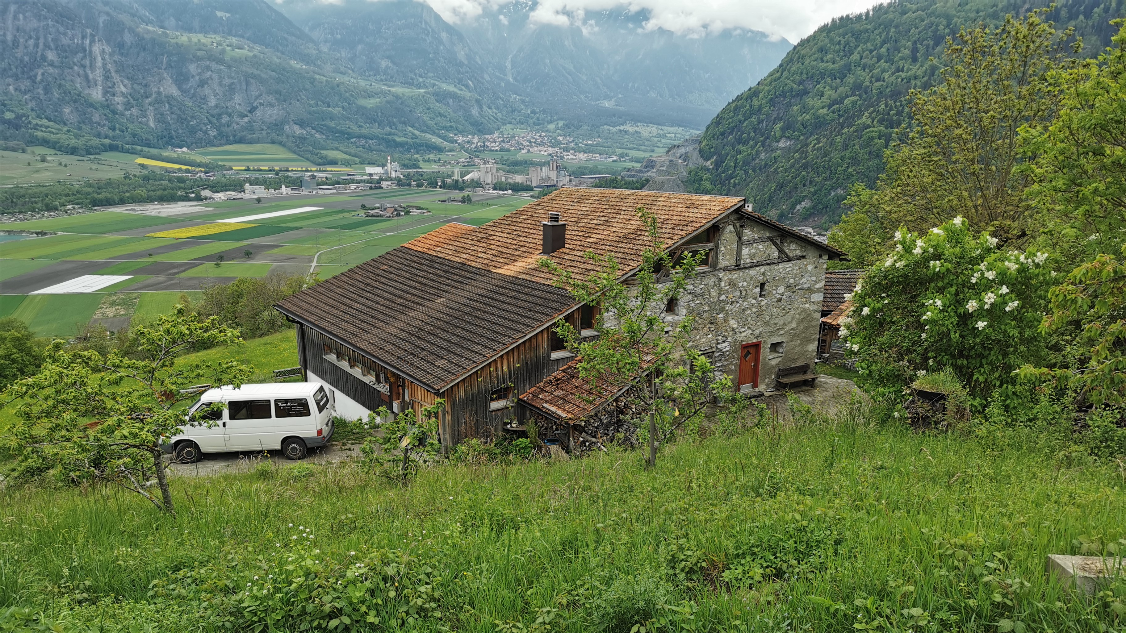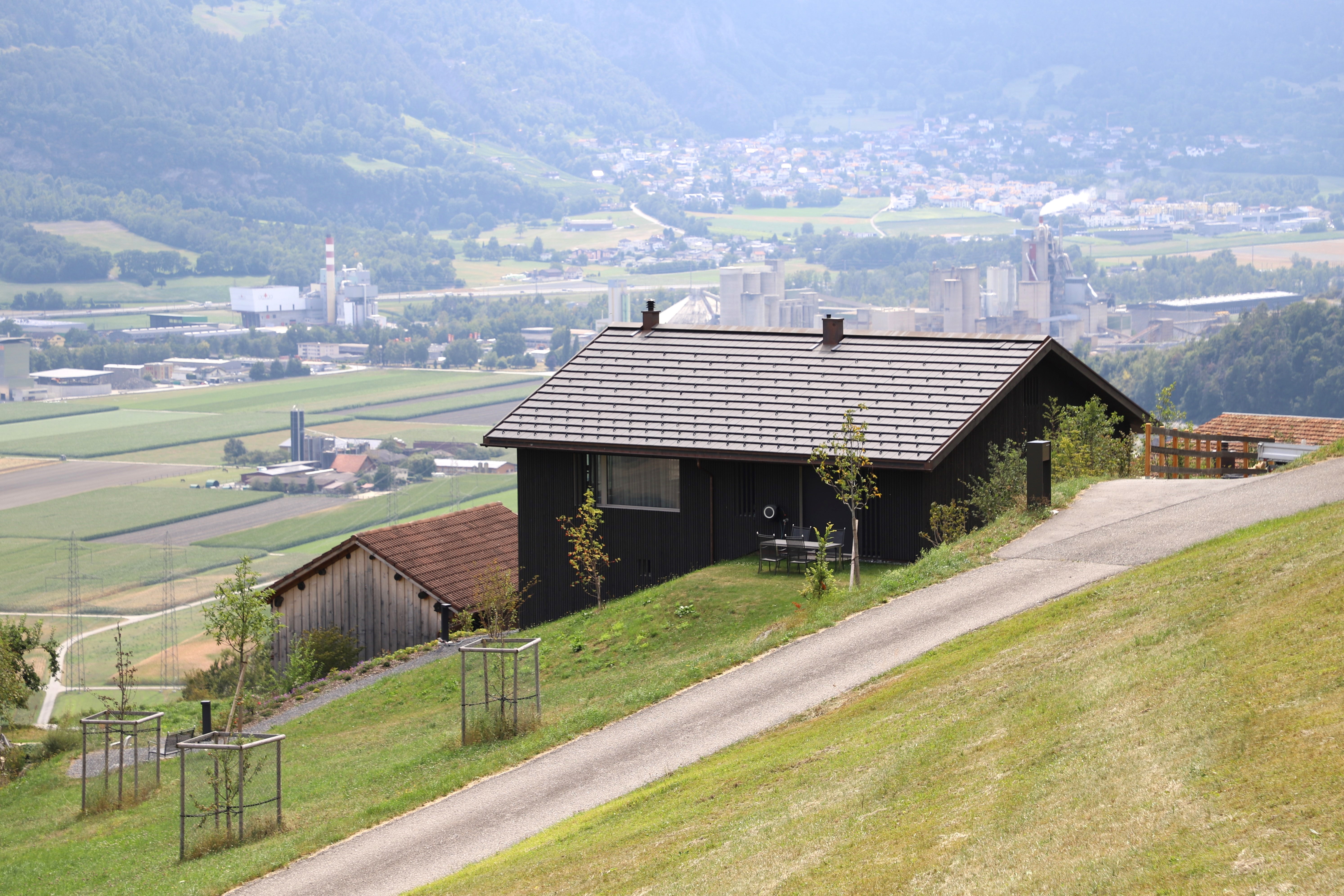 Blick von Nordwesten auf das 2022 errichtete Wohnhaus (Haus 308A) auf ca. 718 m Höhe, im Hintergrund das Rheintal mit Trimmis.
