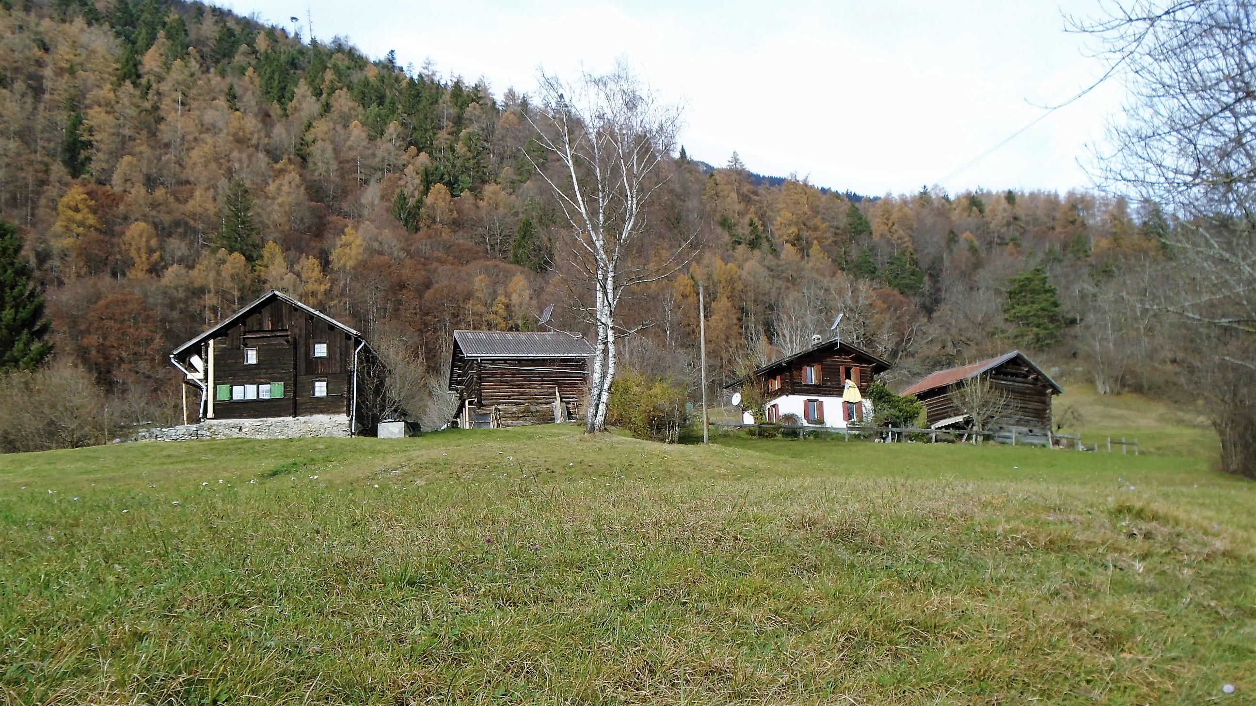 Blick von Osten auf die Gebäude im zentralen Teil von Patnal (auf ca. 740 m Höhe). Links das historische Bauernhaus Patnal Nr. 4 (Haus Nr. 310), direkt rechts…