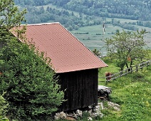 Blick von Südosten auf das Wohnhaus im südwestl. Bereich der Flur auf ca. 733 m Höhe. Links, hinter dem Busch, das zugehörige Stadel.