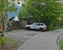Blick nach Osten, links der asphaltierte Zufahrtsweg 'Patnal', rechts Eingang und Gartentor des Wohnhauses. Links ein blühender Fliederbusch, der den nahenden…
