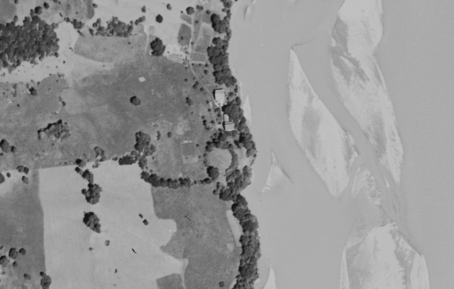 Blick nach Norden über die nördl. Teile der Flur bis zur Gemeindegrenze. Rechts oben Teile des Rheins. In der Bildmitte erhebt sich unscheinbar der dicht…