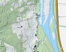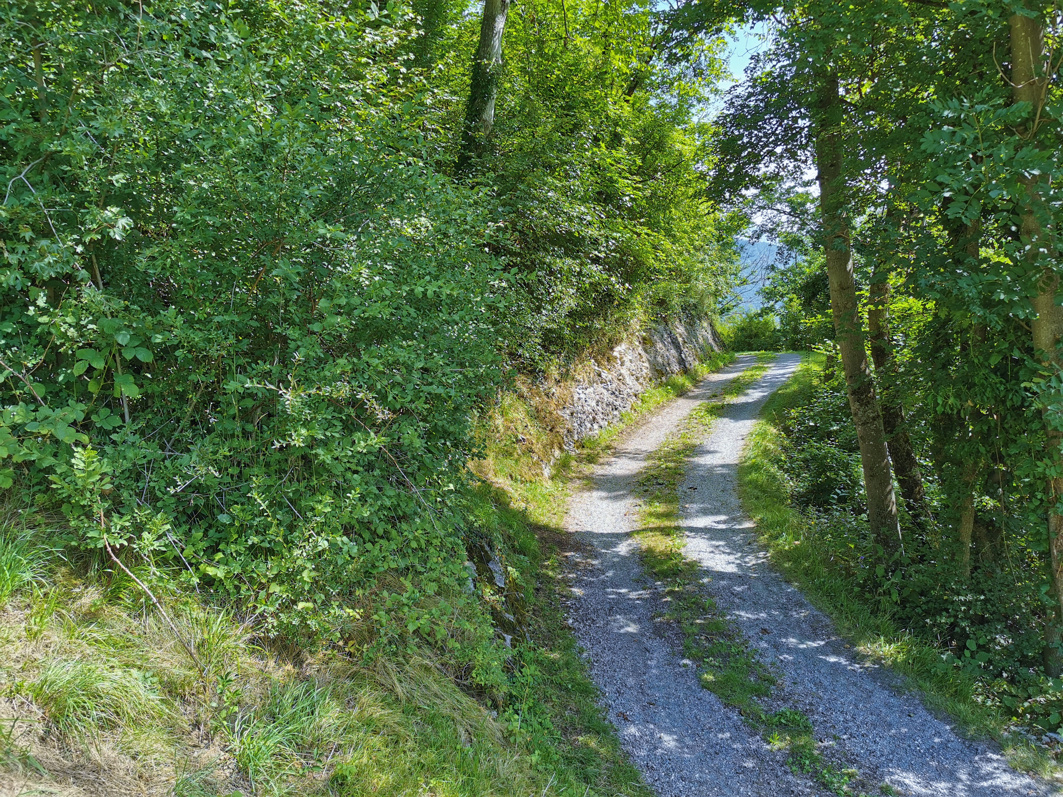Blick nach Norden entlang des Fahrweges in Richtung 'Loch' (Mastrils). Links die dicht bewaldete Erhebung des Burgstelle Friewis. Aufnahme von Juli 2023.