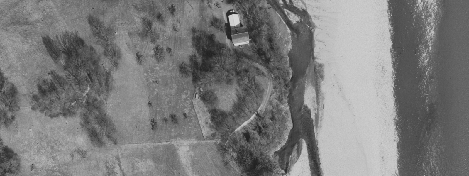 Ausschnitt aus einer Aufnahme von Juli 1940 aus 3.292 m Höhe mit der baumumkränzten, kreisrunden Freifläche der Burgstelle in der Bildmitte. Darüber das Gehöft…