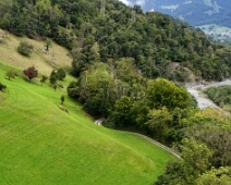 Blick vom Nordrand der Friewiser Flur nach Nordosten über den bewaldeten Hügel hinweg bis zur Prättigauer Chlus. Unten links im Bild die Gebäude am Gehöft…
