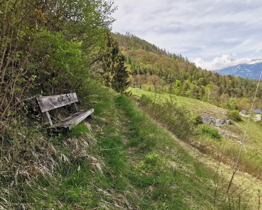 Nur über einen etwas verfallenen Pfad vom Weg zum Wasserreservoir im Bachtobel erreichbar, keine Ausschilderung. Sockel der Bank stark eingewachsen, etwas Gestrüpp um die Bank